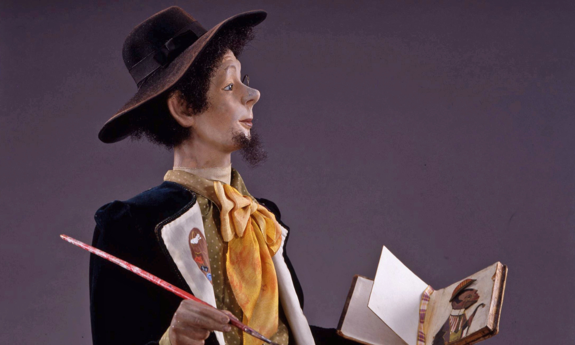 ページが勝手にめくれて着色された猿の顔が現れ画家をからかう。