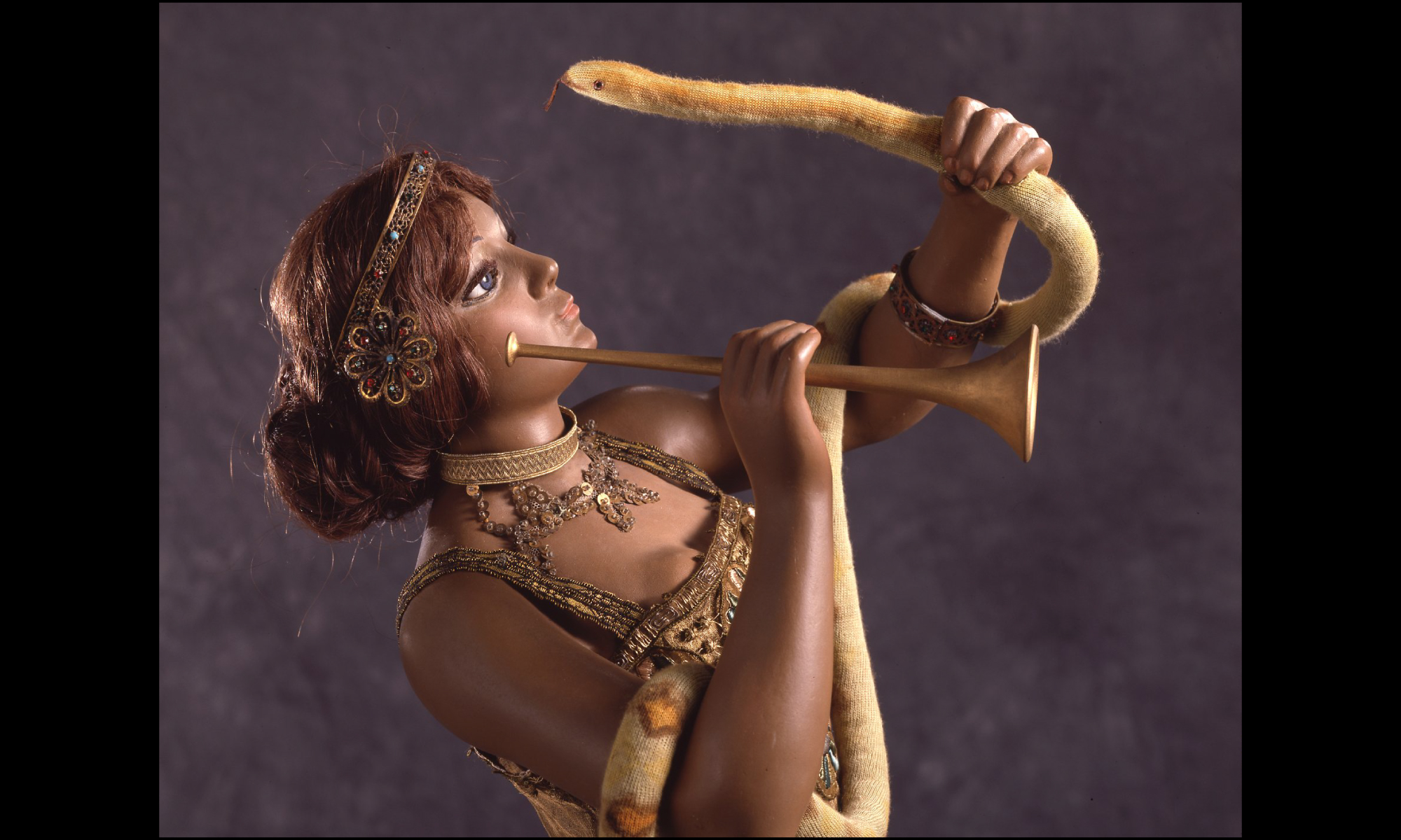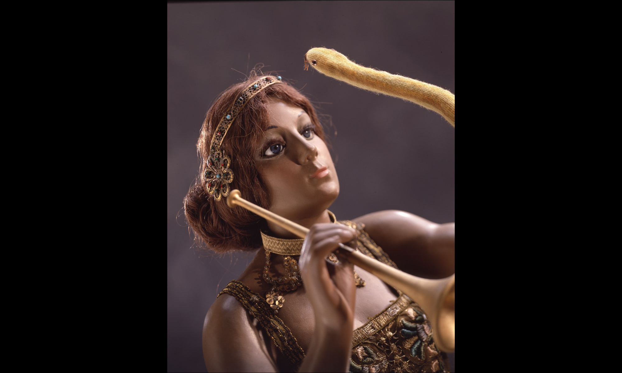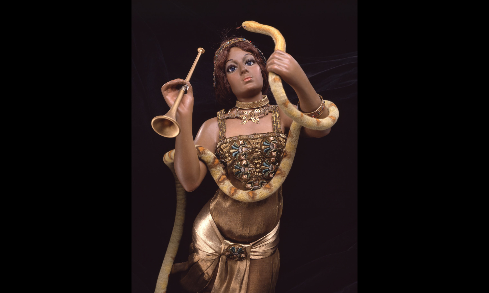 彼女はラッパを吹き、体に巻きついた大蛇を操る。